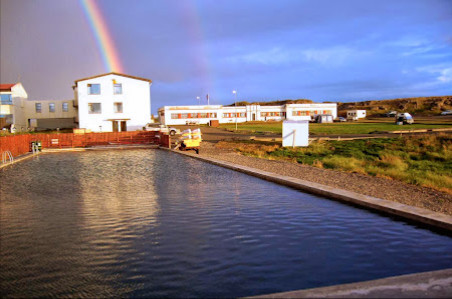 Camping z hotelem w stylu PRL. Daleko od wszystkiego, ale za to jest termalny basen za 1000 ISK od osoby, polecam skorzystać. Kamping nie za wielki.